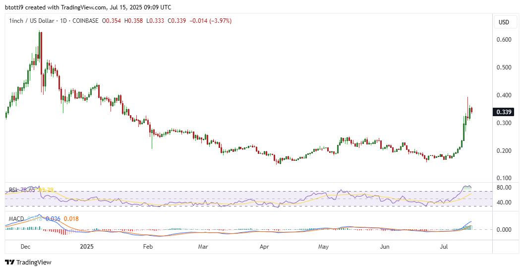 1inch has extended its recent rally, building on gains since rebounding from a low of $0.18 on July 8, 2025.