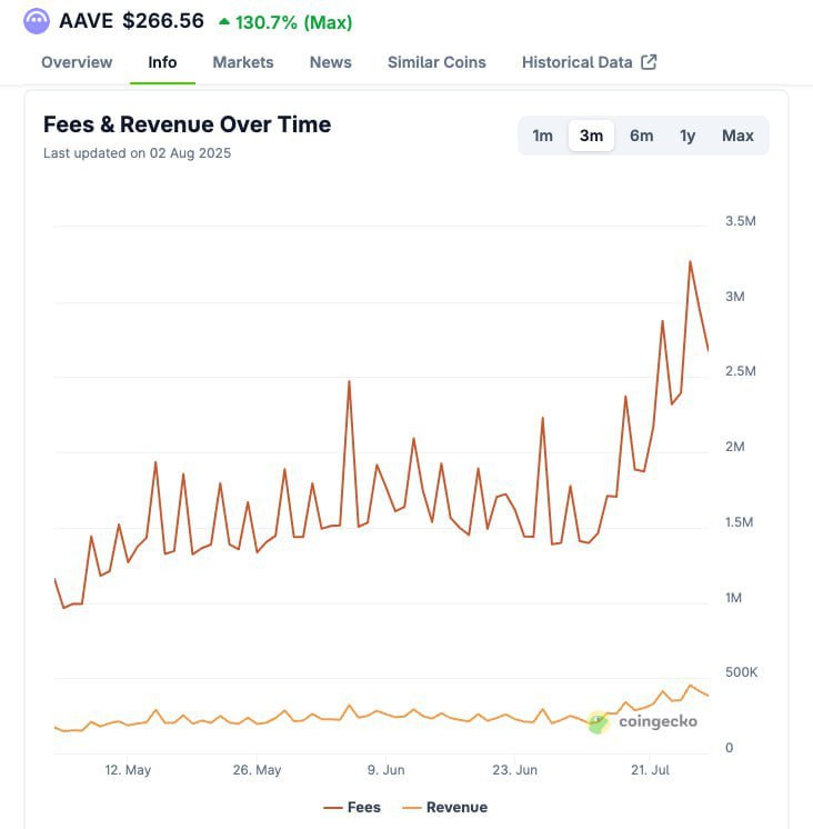 Fees and protocol activity have surged as participants borrow assets, including stablecoins, from Aave.