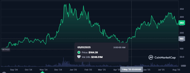 It has gained approximately 60% since May 1 to press time levels of $263.