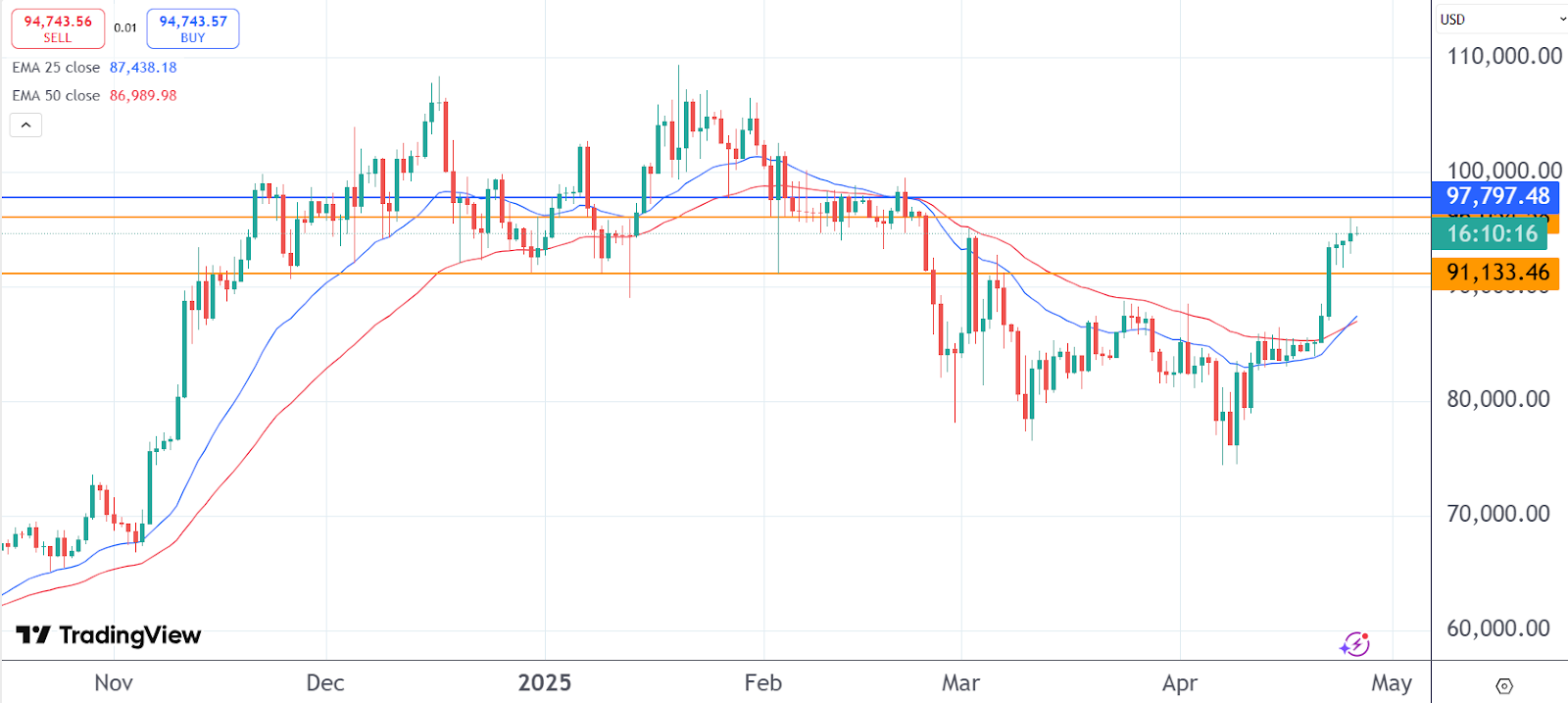 A look at Bitcoin’s daily price chart shows the formation of a bullish golden cross with the short-term 25-day EMA crossing the 50-day MA to the upside. As such, the crypto major will likely continue to hold steady above the support level of $91,133. On the upside, the bulls are gathering momentum to break the current resistance zone of $96,050. Once that happens, the next target will be at a fresh two-month high of $97,797.