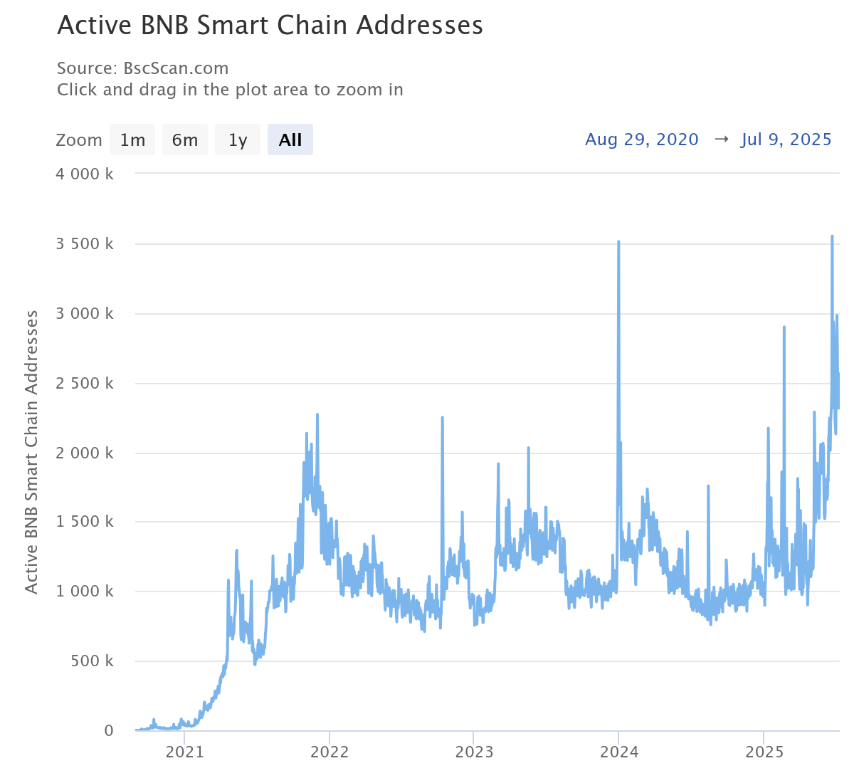 Whale accumulation has intensified in recent weeks, with on-chain data showing over 2.5 million active BNB smart chain addresses — a sign of strong demand and network engagement.