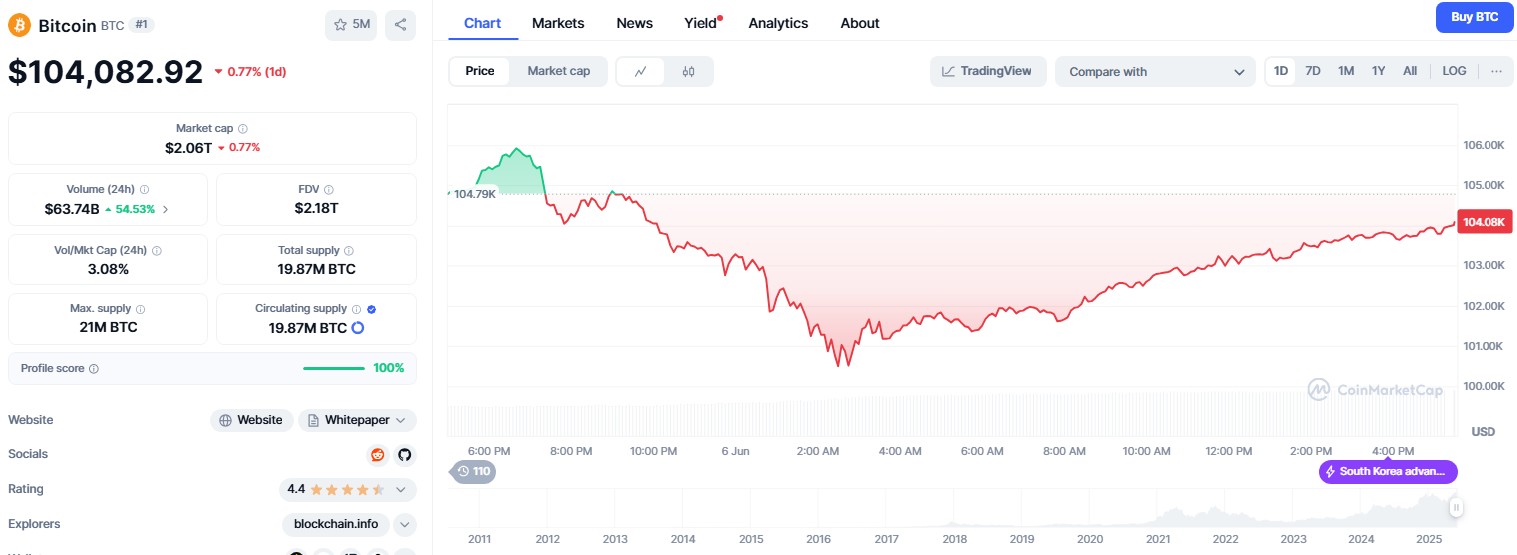 As of Thursday afternoon, Bitcoin is trading at $104,082, down about 1% over the past 24 hours.