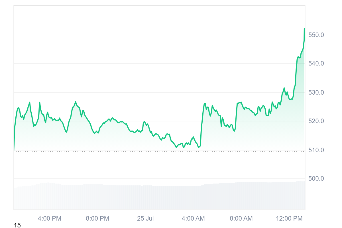 While it’s off its intraday highs of $554, it remains above the $550 mark, up as one of the top gainers in the past 24 hours.