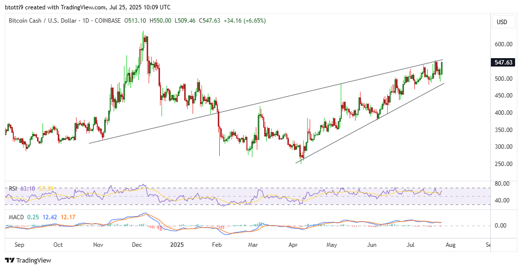 - Bitcoin Cash has seen a notable surge in the past 24 hours, gaining 8% to $554.