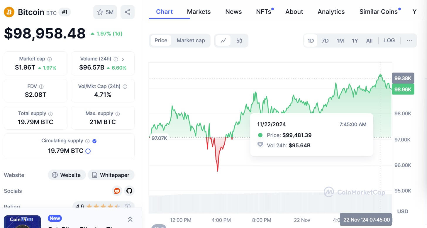 Bitcoin came within touching distance of $100,000 on November 22 as the asset continues its bull run since the beginning of November.