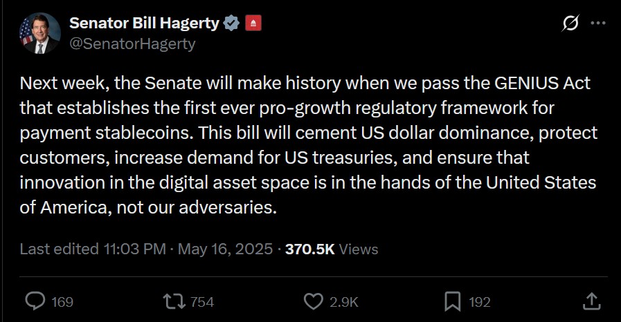 In his recent Xeet, lawmaker Bill Hagerty said the Senate could pass the aforementioned bill this week, which he believes will be a “historic” development given the Act “establishes the first ever pro-growth regulatory framework for payment stablecoins.”