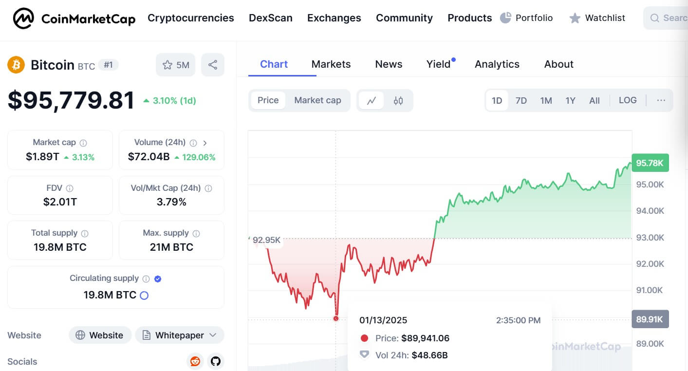 Data from CoinMarketCap shows that Bitcoin’s price dropped to around $89,900 on January 13. However, at the time of publication, it’s trading over $95,000.