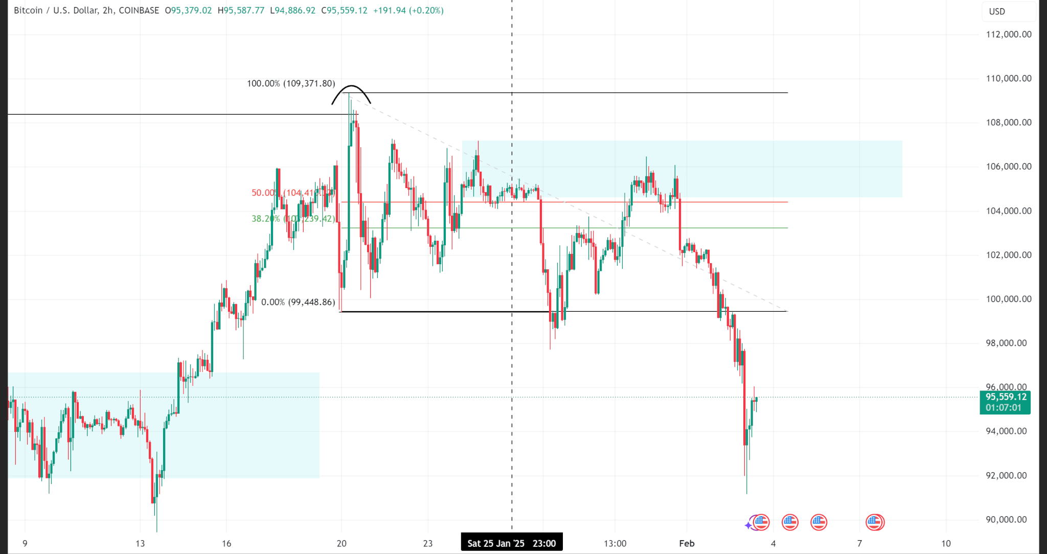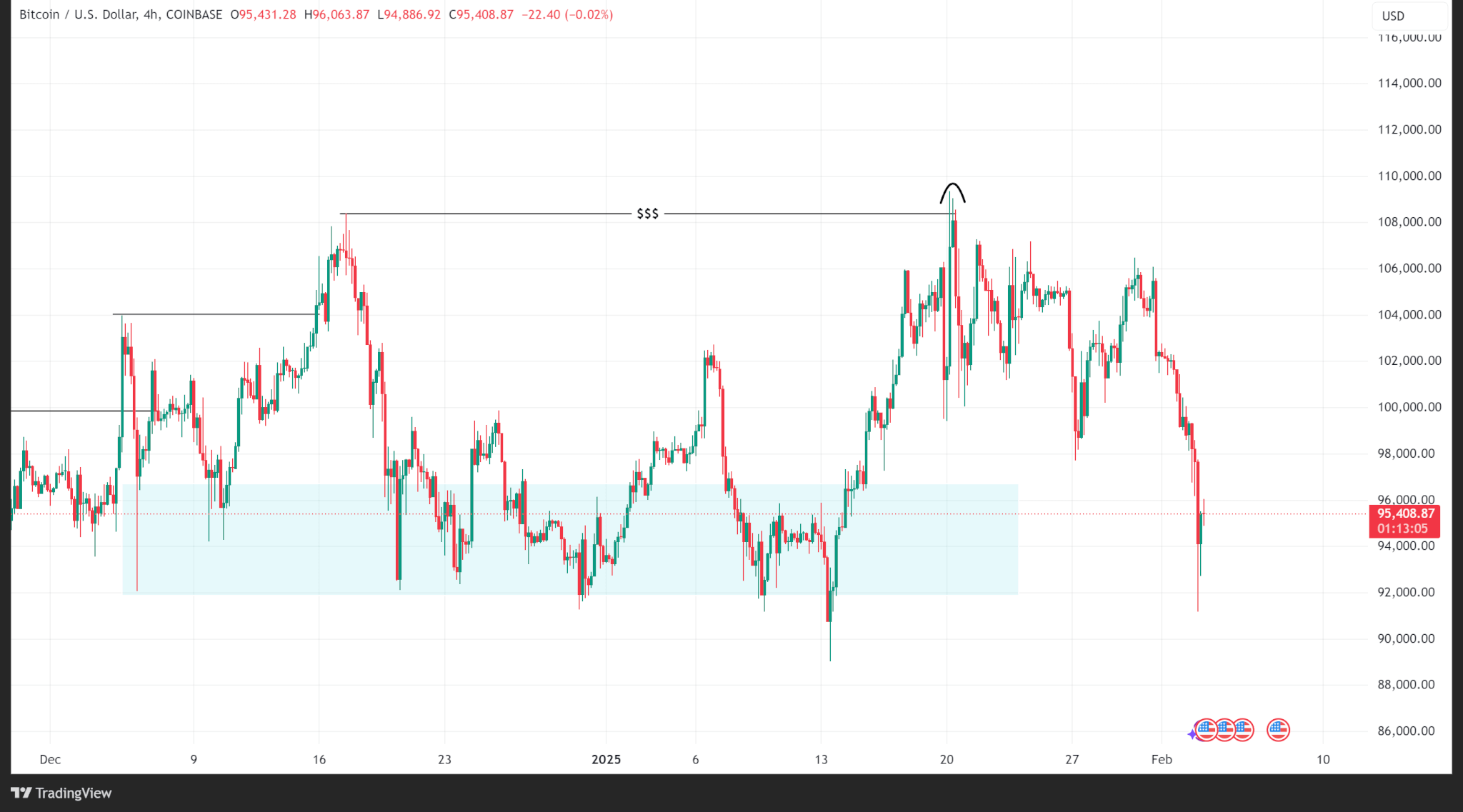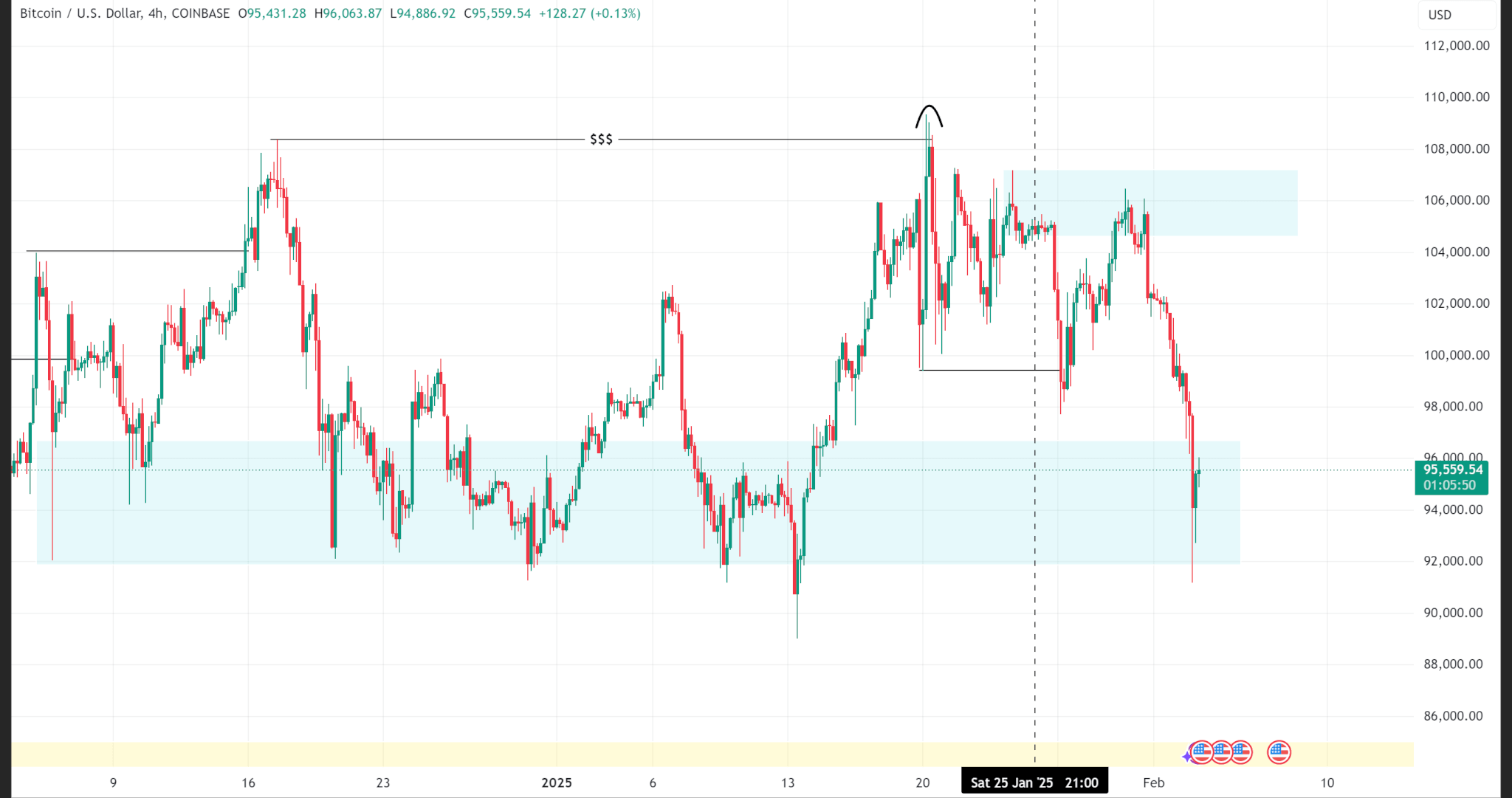 After being rejected by internal supply, the price broke down further on Friday, Jan. 31, and over the weekend to settle at the next major demand level, between $92,000 and $96,000.