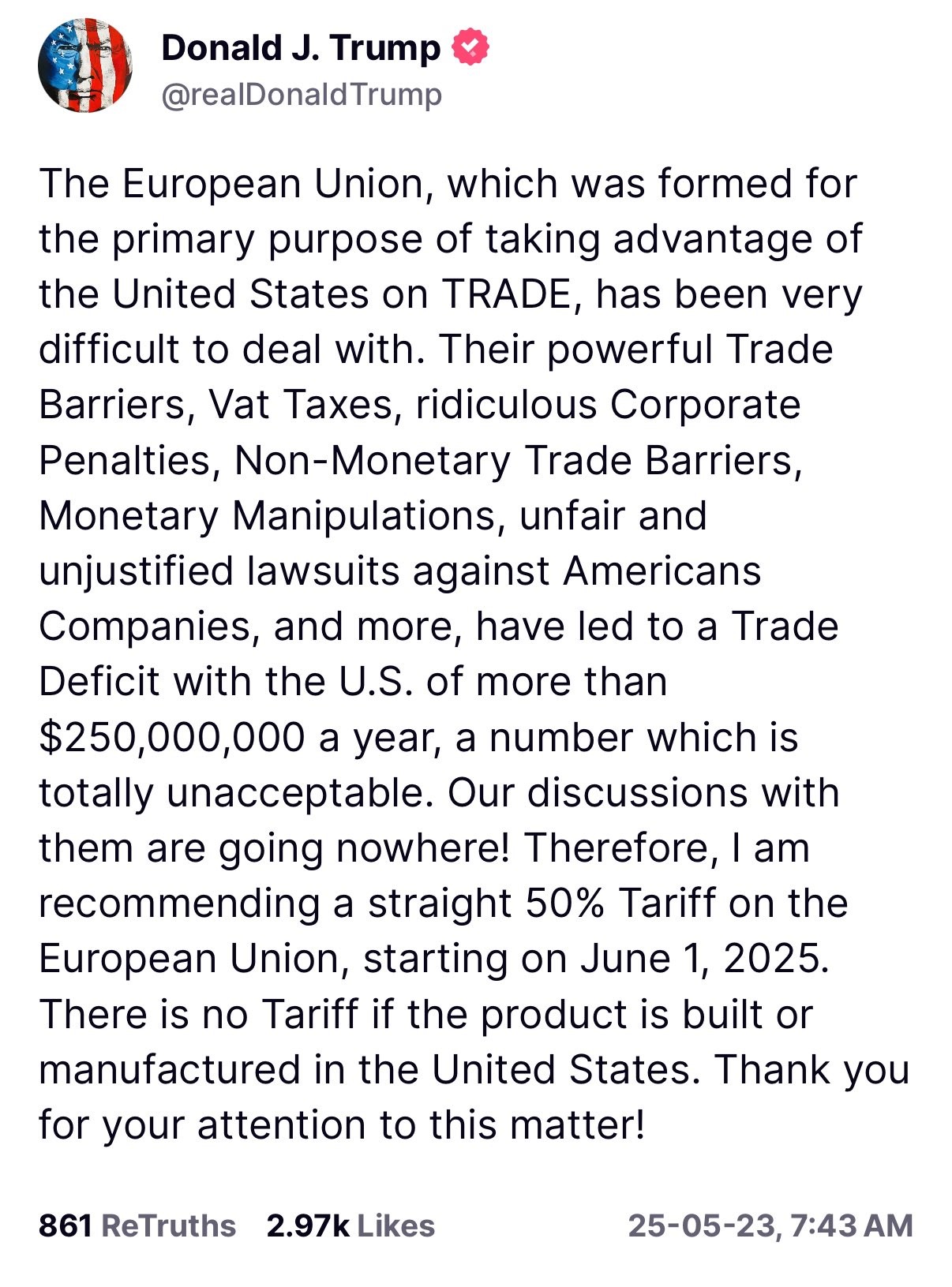 - Cryptocurrencies have seen a sudden dip as Trump proposes a 50% tariff on EU goods.