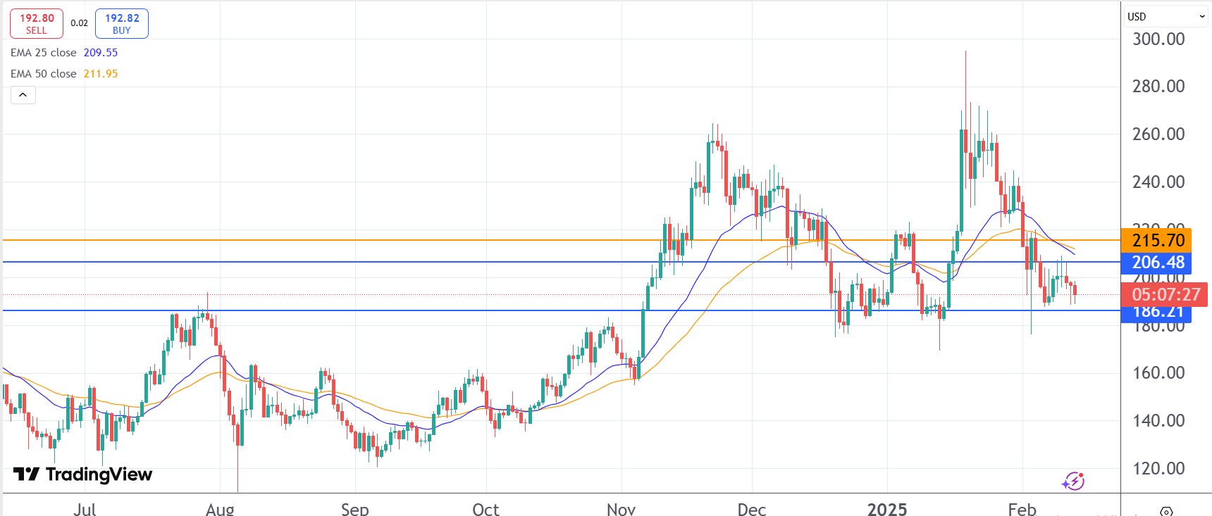 In the meantime, the bulls are keen on defending the support at $186.21. On the upside, additional momentum may have it break the resistance at $206.48. However, a rebound past $215.70 to rubberstamp a trend reversal.