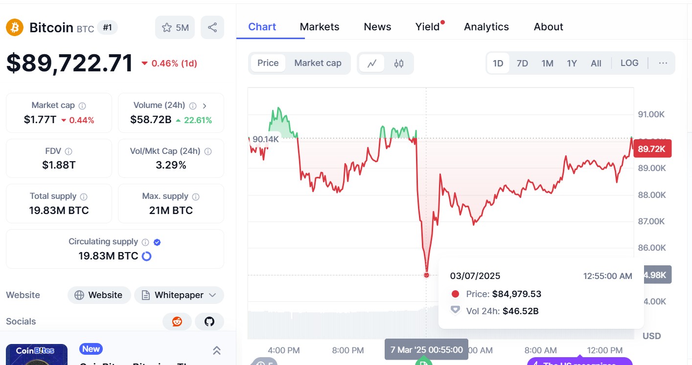 Data from CoinMarketCap shows Bitcoin is trading around the $88,000 mark, dropping over 1.50% in the last 24 hours.
