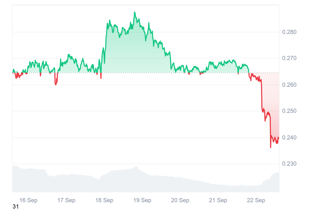 Dogecoin’s value dropped by 10%, dropping to $0.23. This decline followed a period of consolidation, with DOGE trading between $0.23 and $0.26.