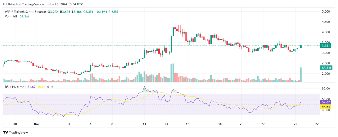 Upon the listing announcement, Dogwifhat experienced a brief surge in price, climbing by 7.73% to reach $3.57 before stabilizing at around $3.351.
