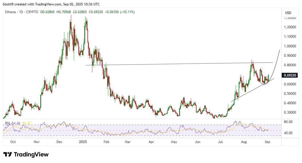 Ethena price is back near the $0.70 mark after its latest uptick, with ENA’s current daily chart displaying a potential cup and handle pattern.