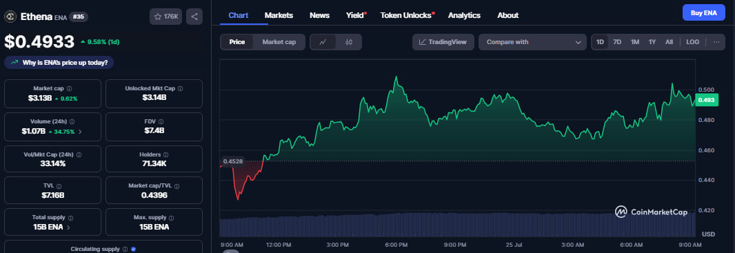ENA hovers at $0.4933 after correcting from intraday highs.