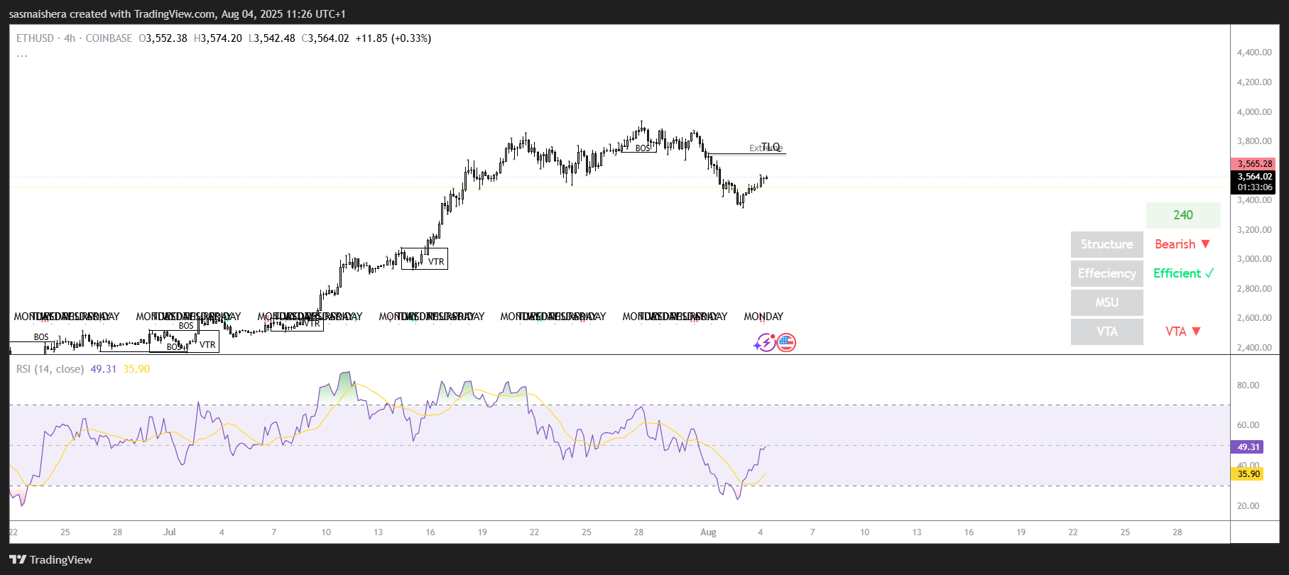 The ETH/USD 4-hour chart is bearish and efficient after Ethereum price closed below its daily support level of $3,730 over the weekend. The recovery above $3,500 shows that Ether found support around its 78.6% Fibonacci retracement level at $3,392. At the time of writing, it continues its recovery, trading above $3,500.
