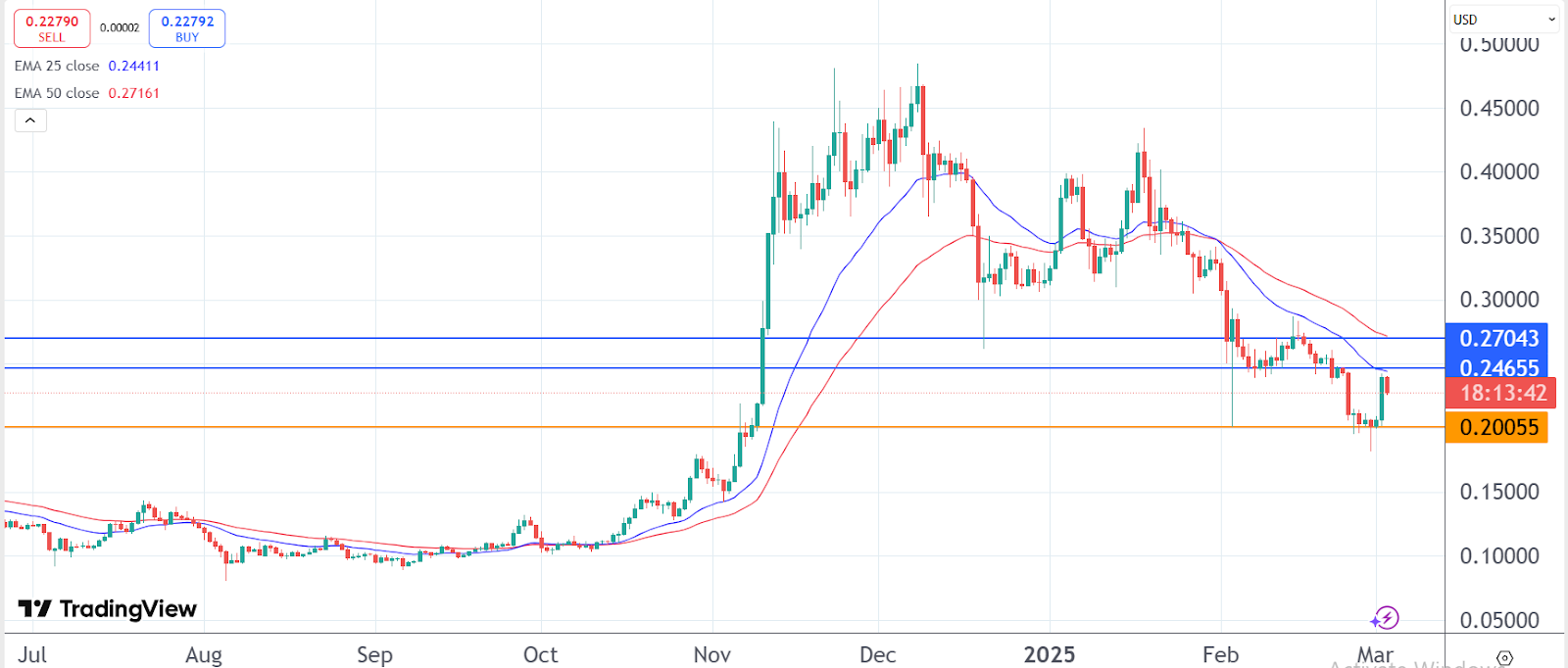 A look at its daily chart indicates the continuation of the bearish death cross pattern with the 25-day EMA holding below the medium-term 50-day MA. In the short term, the bulls will be keen on breaking the resistance along the 25-day EMA at $0.2465. If successful, the next target will be at $0.2704. However, this bullish thesis will be invalid by a move below the support zone of $0.2000.