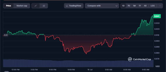 The digital coin gained from a daily low of $0.8779 to $0.9408 intraday peak.