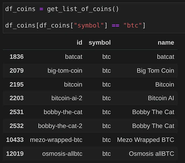 In order to make use of the OHLC API endpoint, we need to know the coin ID. Here’s the function we can use to fetch the list of coin IDs for a given symbol such as “btc”.
