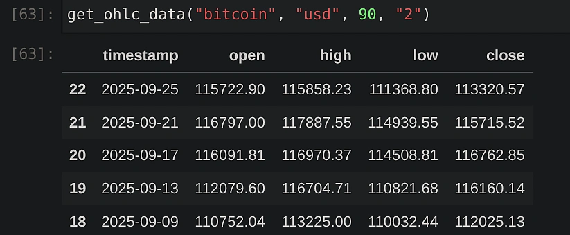 The function below takes the additional parameters as input arguments. The API response is converted into a Pandas DataFrame with columns for ‘timestamp’, ‘open’, ‘high’, ‘low’, and ‘close’. The timestamp is also converted to a standard DateTime format for better readability and sorted for consistency.