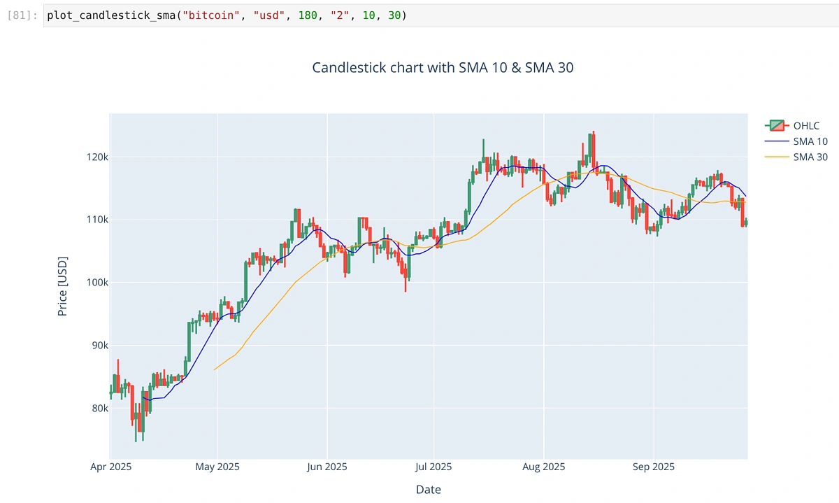 In this tutorial, we have successfully created a practical toolkit for crypto market analysis. Starting from fetching historical OHLC data through the CoinGecko API, we learned how to visualize price action with candlestick charts, overlay technical indicators like SMA, RSI, Bollinger Bands, MACD, and even detect candlestick patterns programmatically. Together, these elements form the foundation of a crypto technical analysis pipeline.