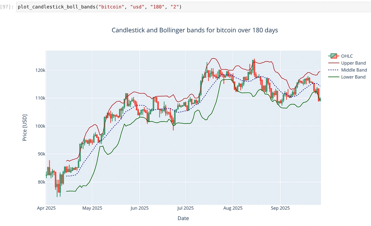 Below is the resulting chart for BTC-USD over 180 days. The middle band is the SMA, displayed as a dotted line for clarity.