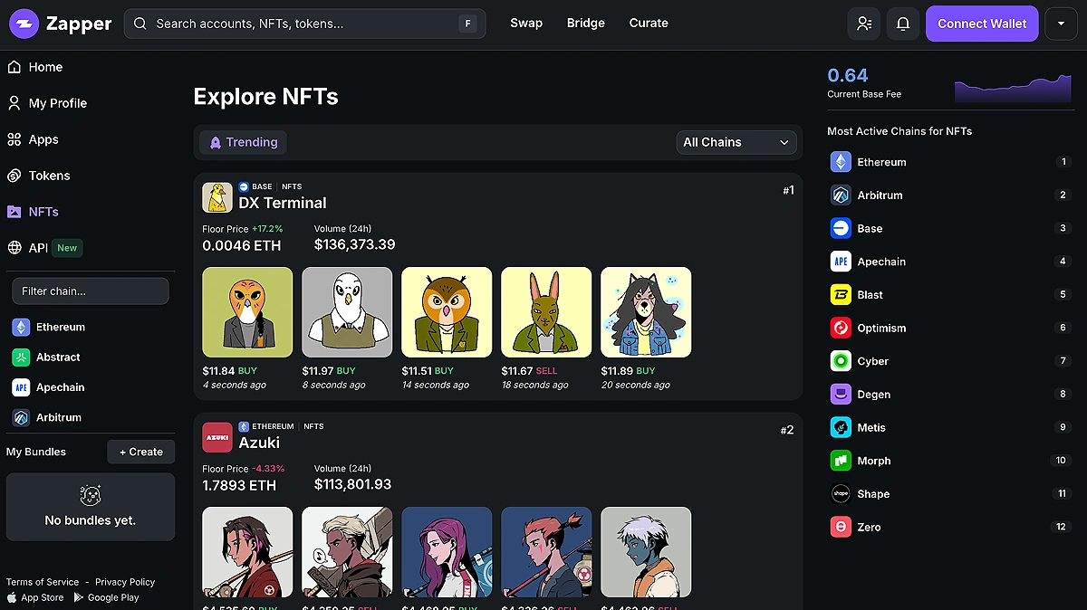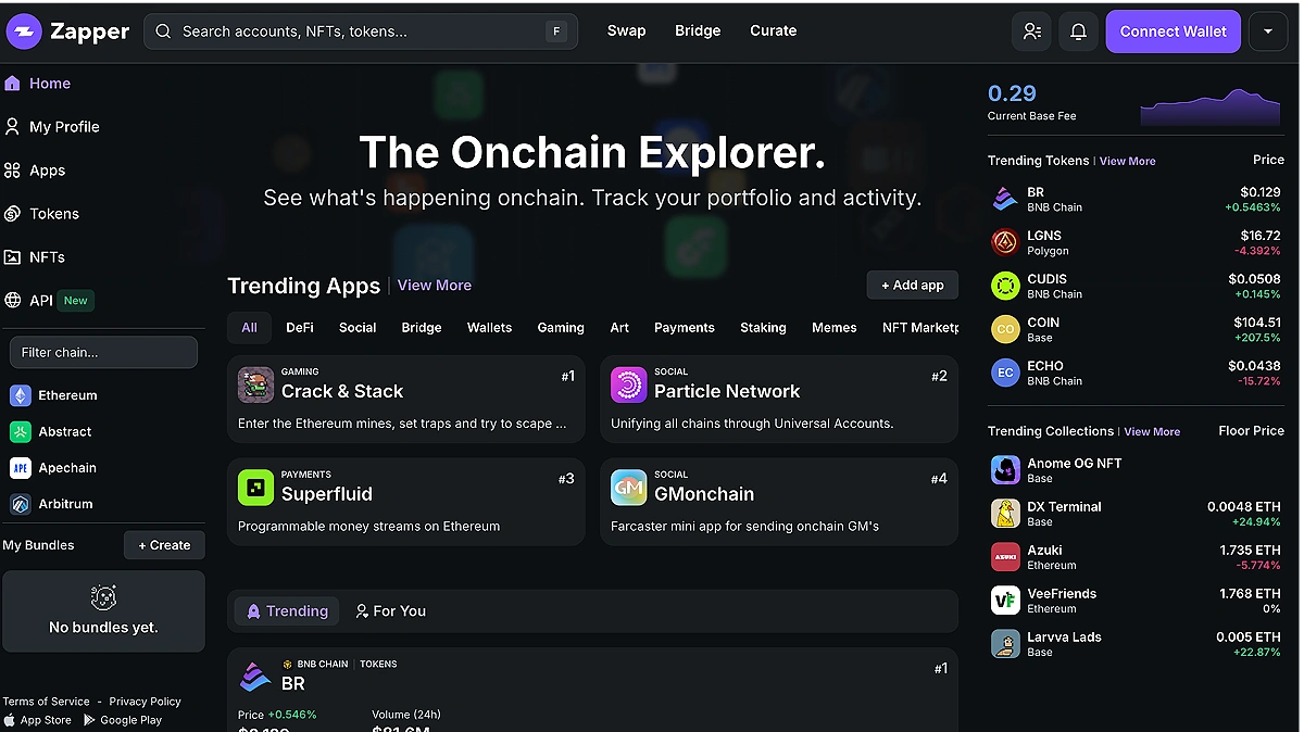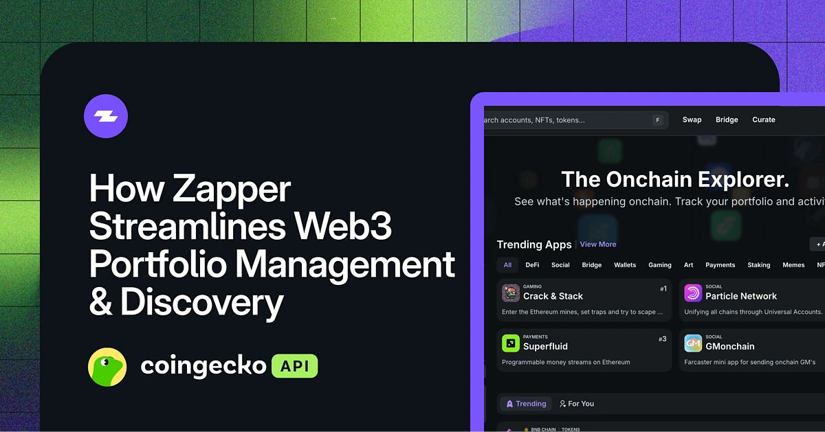 Zapper’s unified onchain explorer showcases real-time portfolio tracking, trending tokens, NFTs and DeFi applications. The platform displays live pricing data for thousands of tokens across multiple blockchain networks, powered by CoinGecko’s enterprise API infrastructure.