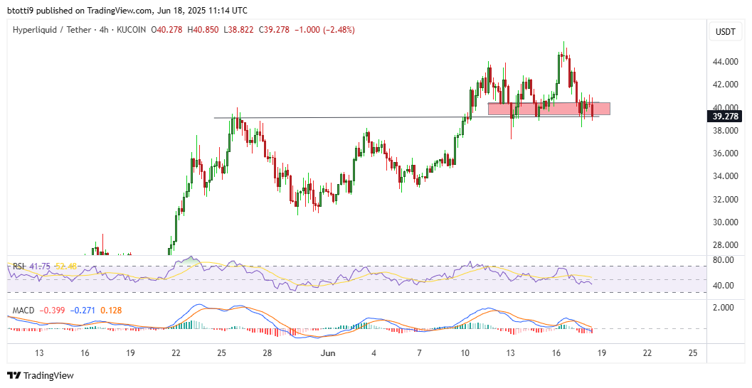HYPE’s price has struggled to maintain momentum above $40, dropping to $39.89 after failing to sustain a recent peak of $45.50.