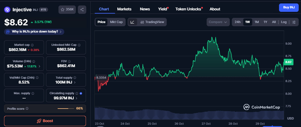 INJ is trading at $8.66. It has consolidated between $9 and $8 over the previous week, gaining over 3% in that timeframe.