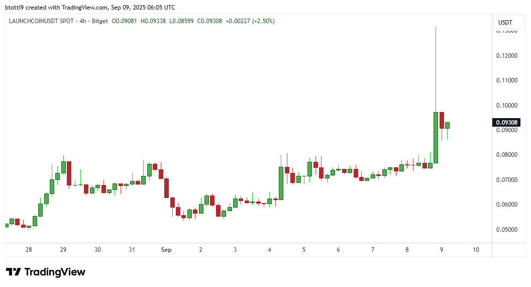 LAUNCHCOIN’s price currently hovers around $0.091, slightly off its intraday high. The $0.08 level, above which bulls took charge for the spike, is likely to be critical if price falls further.