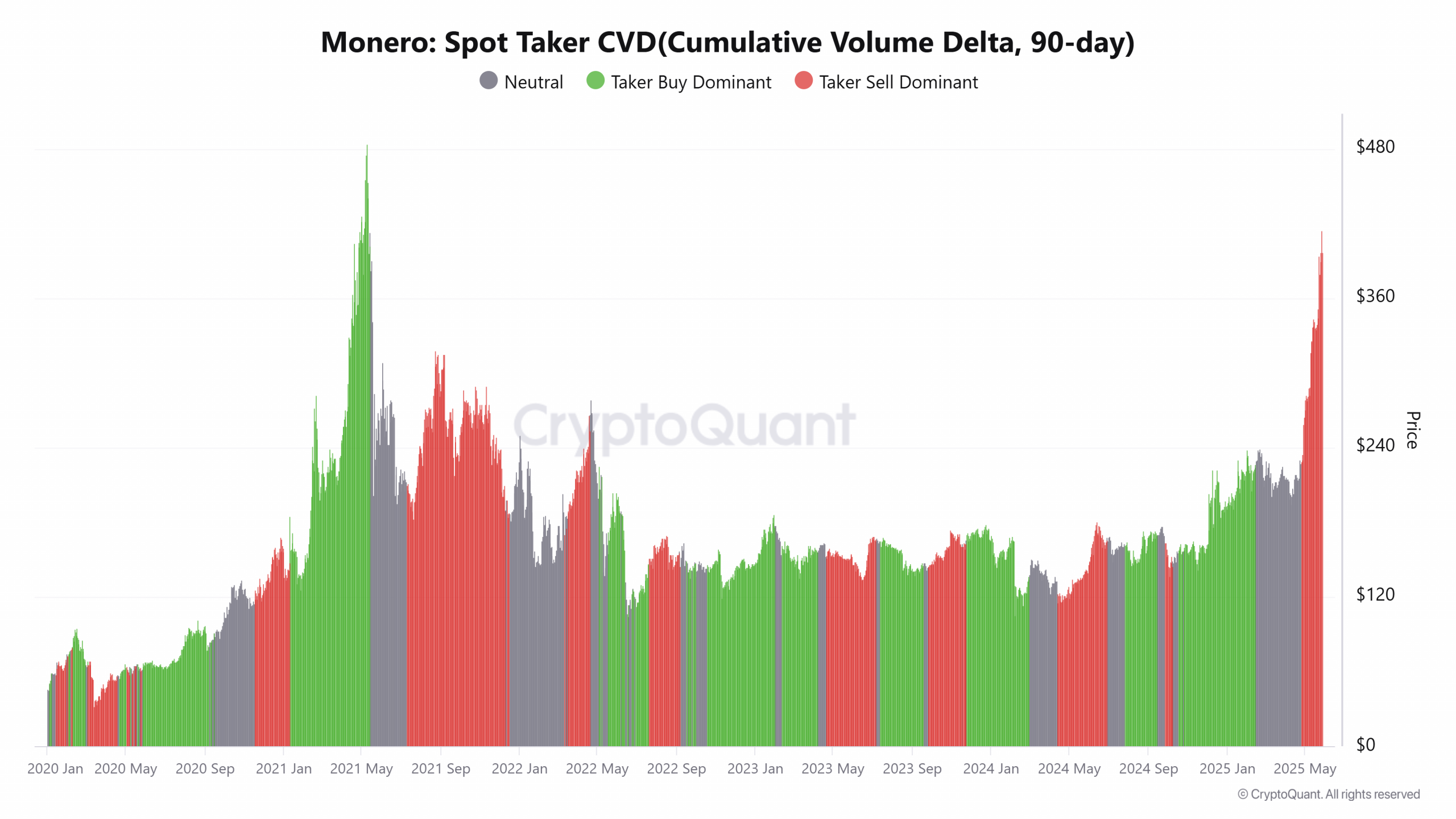 On-chain data from CryptoQuant reveals that Monero’s Spot Cumulative Volume Delta (CVD) has remained red throughout May, indicating a sustained sell-side dominance that continues to weigh down price momentum.