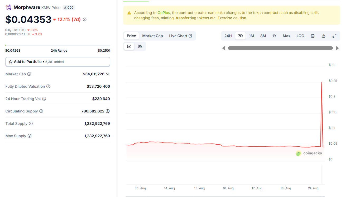 Morphware’s 24-hour trading volume stood at just $241,276, far too low to support a rapid surge in valuation.