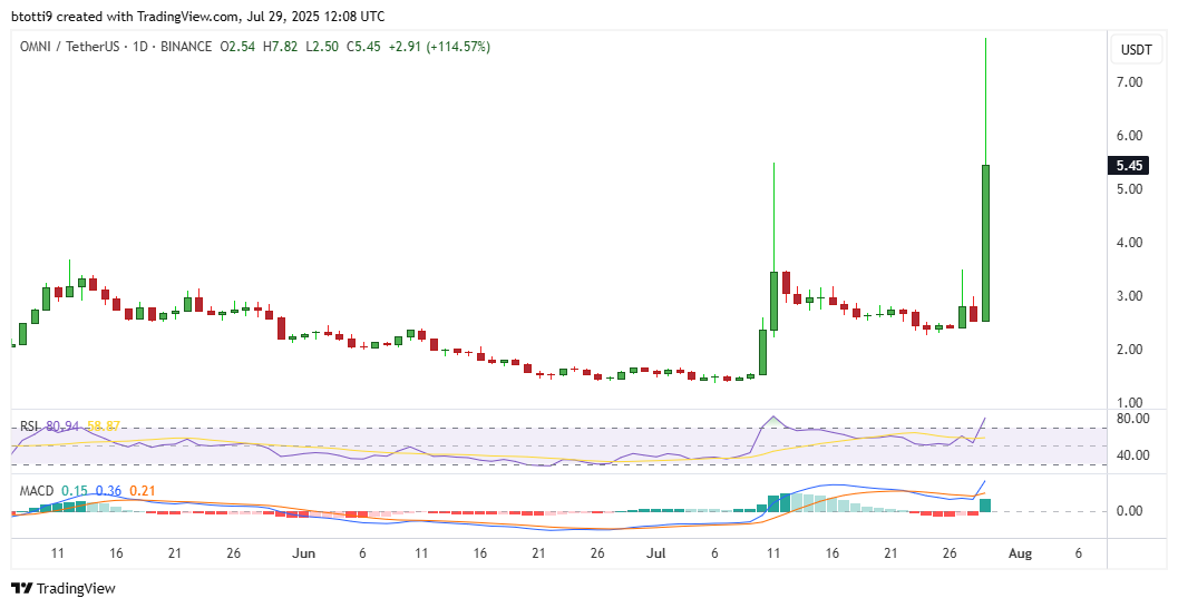 OMNI’s price experienced a volatile swing following the news, with the token reaching a high of approximately $7.13.