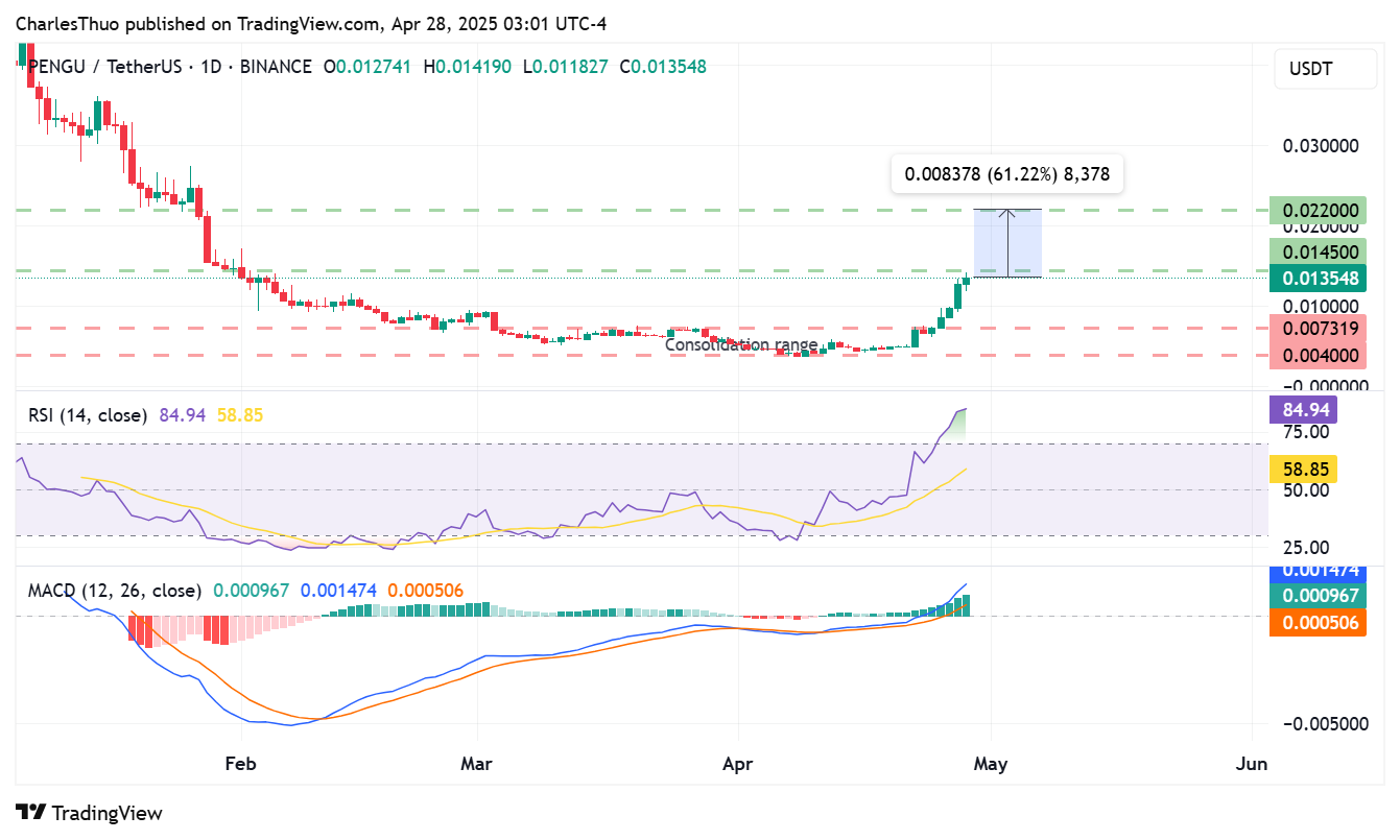 With PENGU’s price already up over 43% in a day, the focus now shifts to its next targets, starting with the critical resistance level at $0.0145.