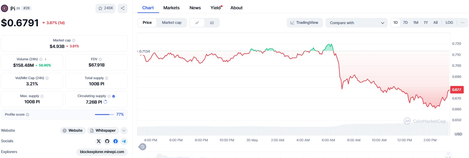 Pi has lost a crucial support level and now trades at $0.67, down from $0.71 just a day ago.