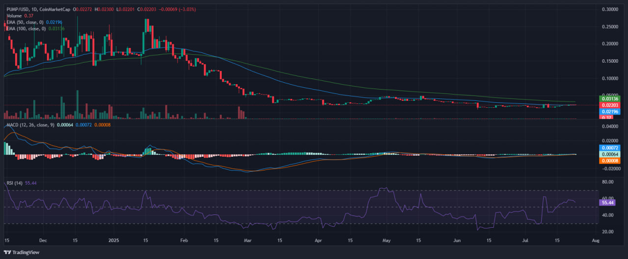 Pump.fun’s native token has lost nearly 4% in the past 24 hours to trade at $0.02202.