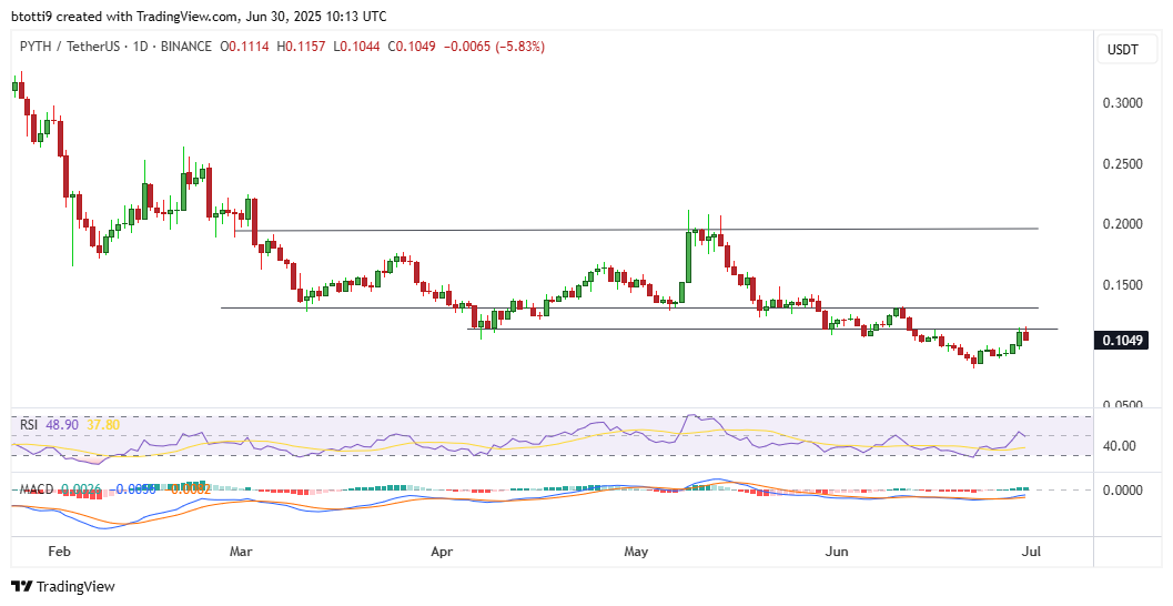As of writing on June 30, 2025, PYTH trades at around $0.10, having touched highs of $0.11.