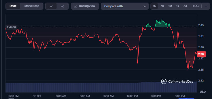 XRP hovers at $2.38 after losing more than 3% in the past 24 hours.