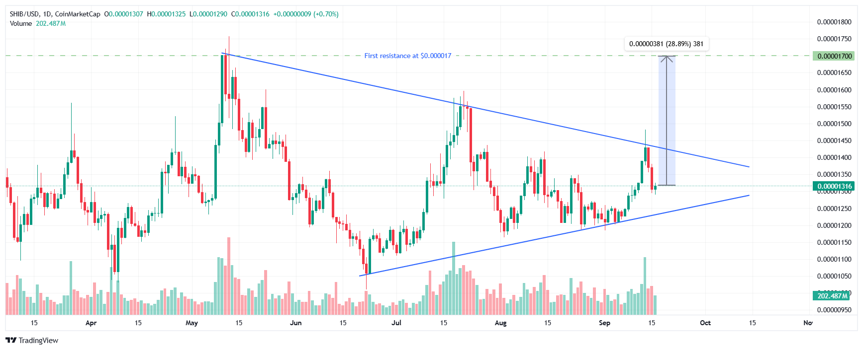 Notably, the Shiba Inu price has been tightening within a symmetrical triangle pattern, with consolidation around $0.00001316.