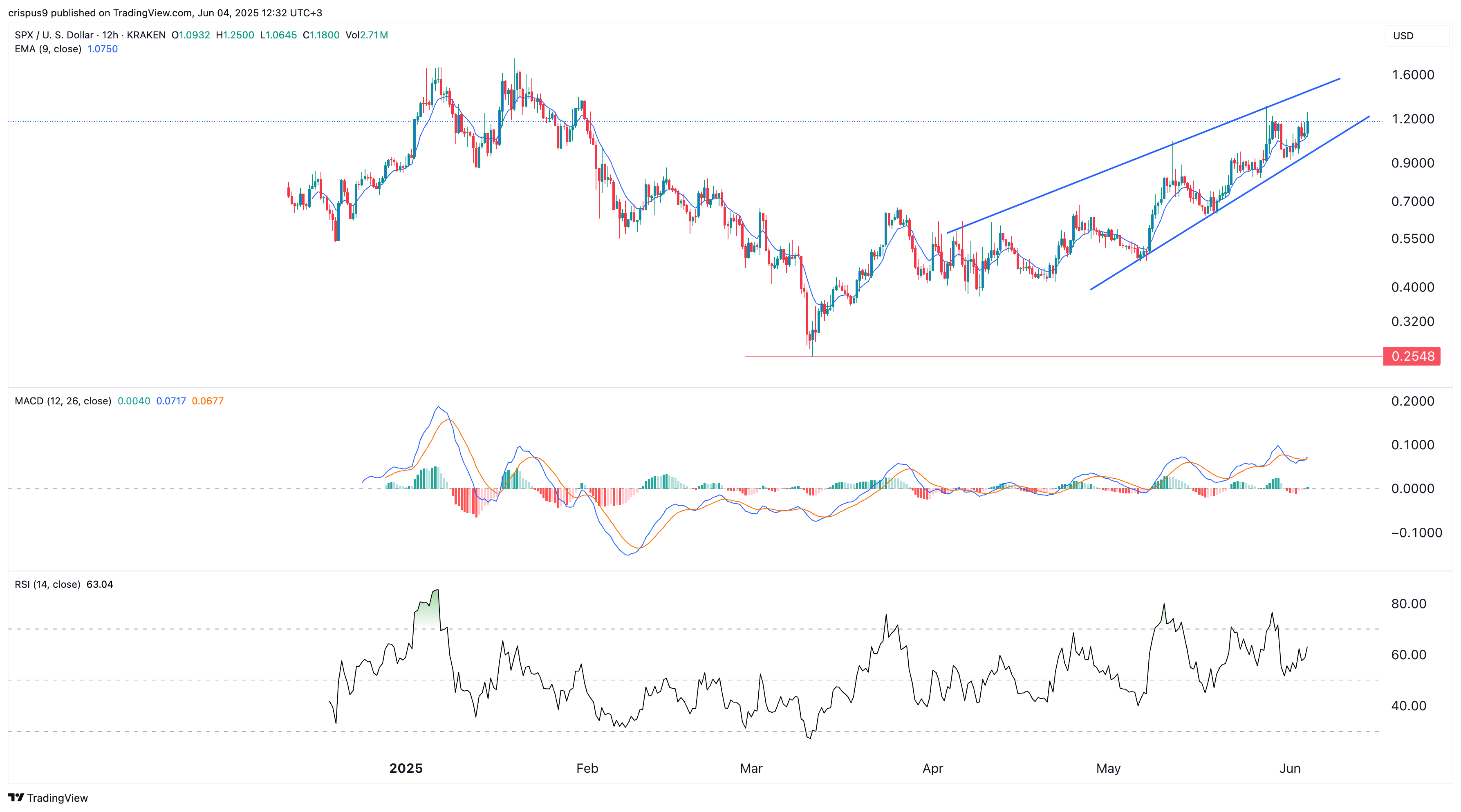 The 12-hour chart shows that the SPX token price has surged from a low of $0.2548 in May to $1.5 today. It has remained above the 50-period and 25-period exponential moving averages, a sign that investors are in control.