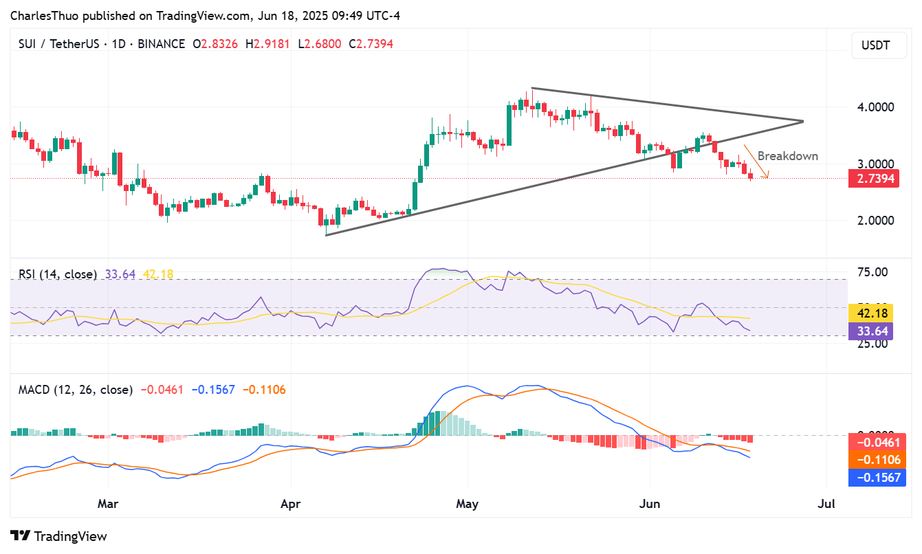 SUI recently broke down from a triangle pattern, triggering a wave of selling that has pulled the token back to a familiar support level at $2.78, which acted as a floor in late March.