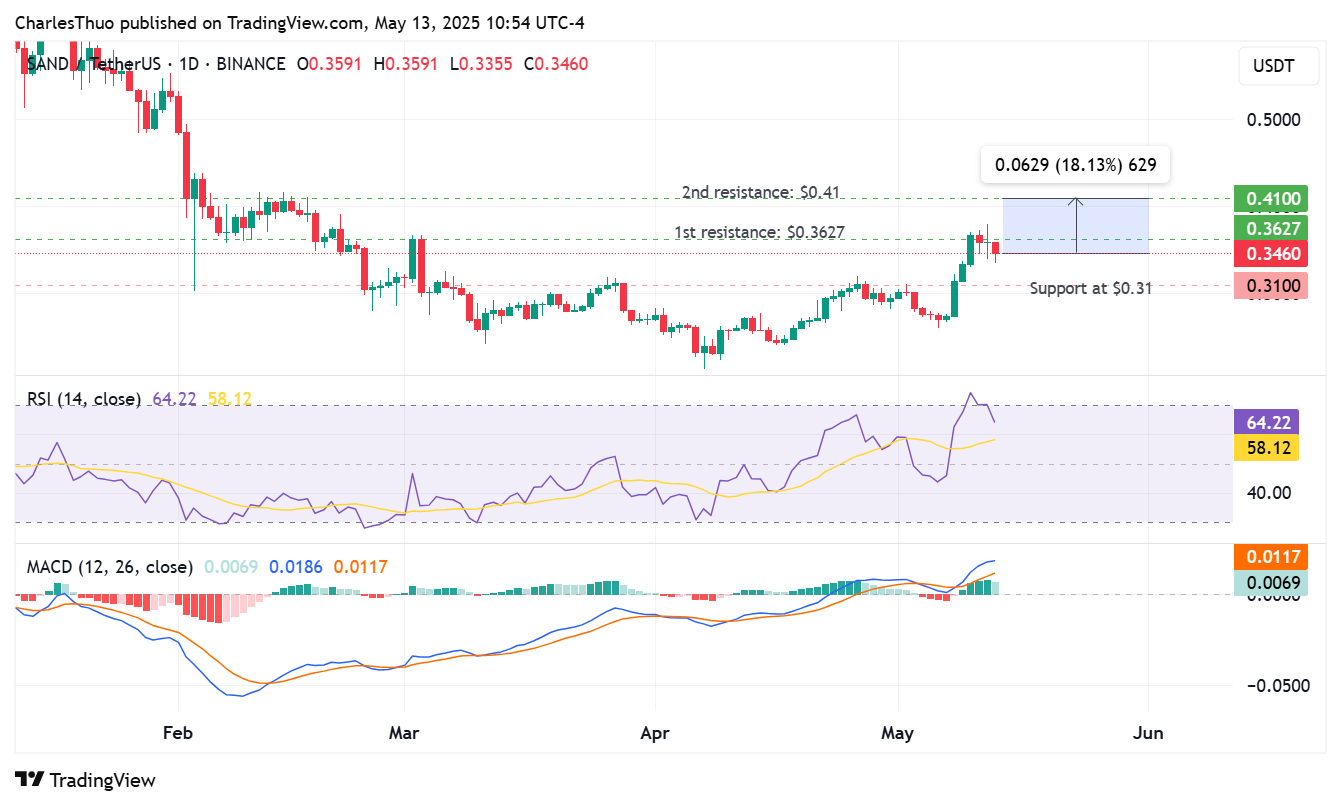 From a technical perspective, the Relative Strength Index (RSI) is at 64 after briefly entering the overbought region on the daily chart, suggesting that while SAND has been on an upward trend, it is currently cooling off in anticipation of the next move.