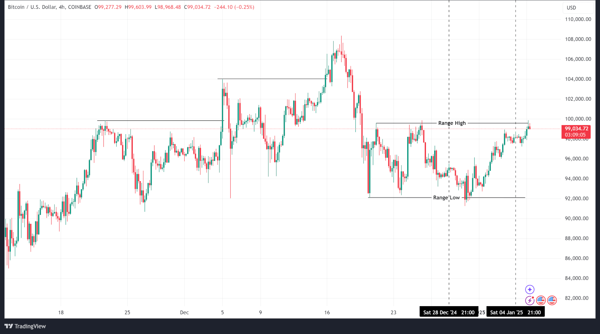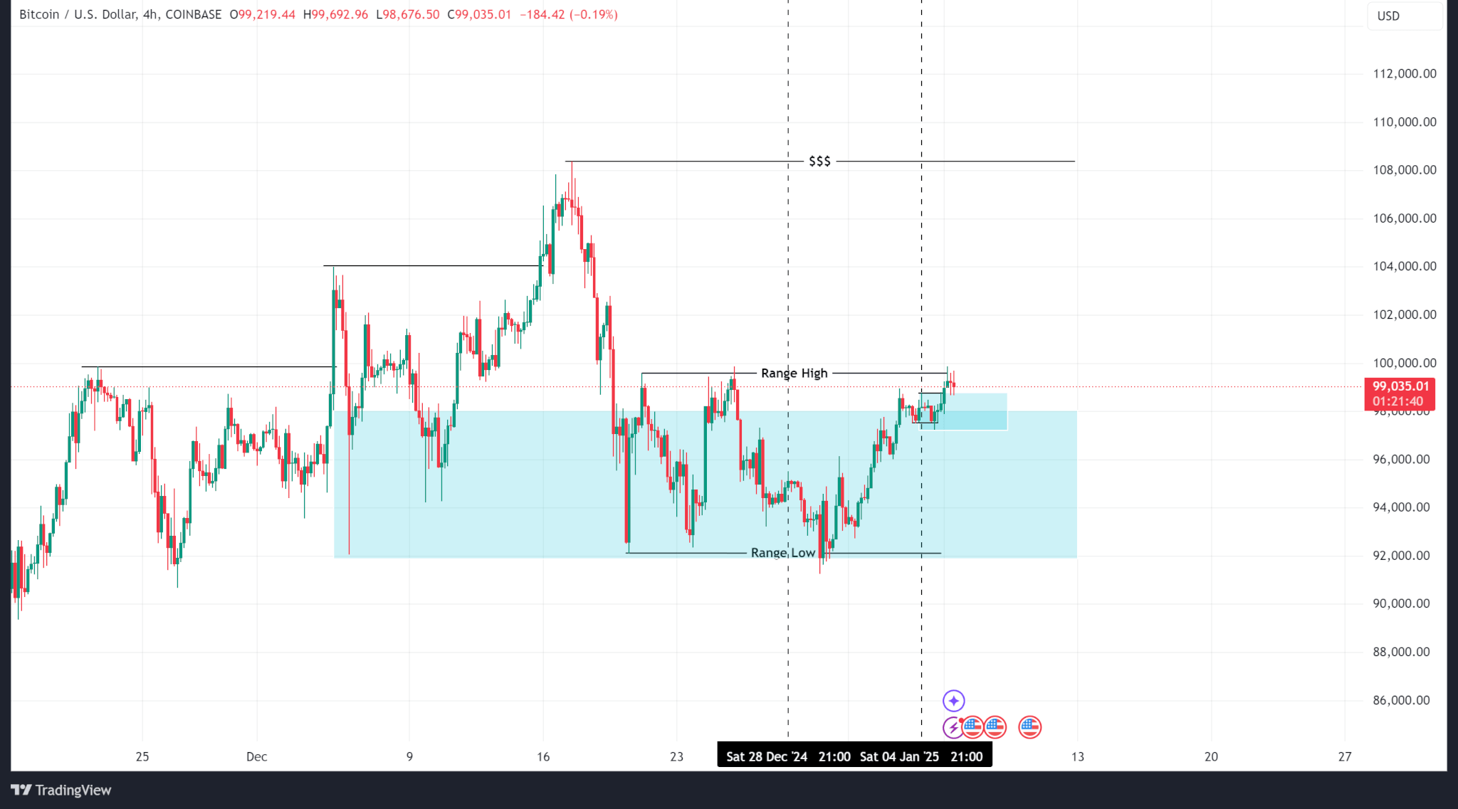 BTC found support within the demand zone on the H4 time frame and has begun a rise (supported by new futures longs). BTC will need to first break above the range high at $99,596.57.