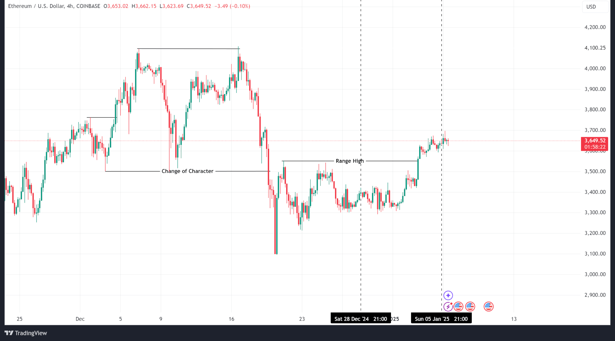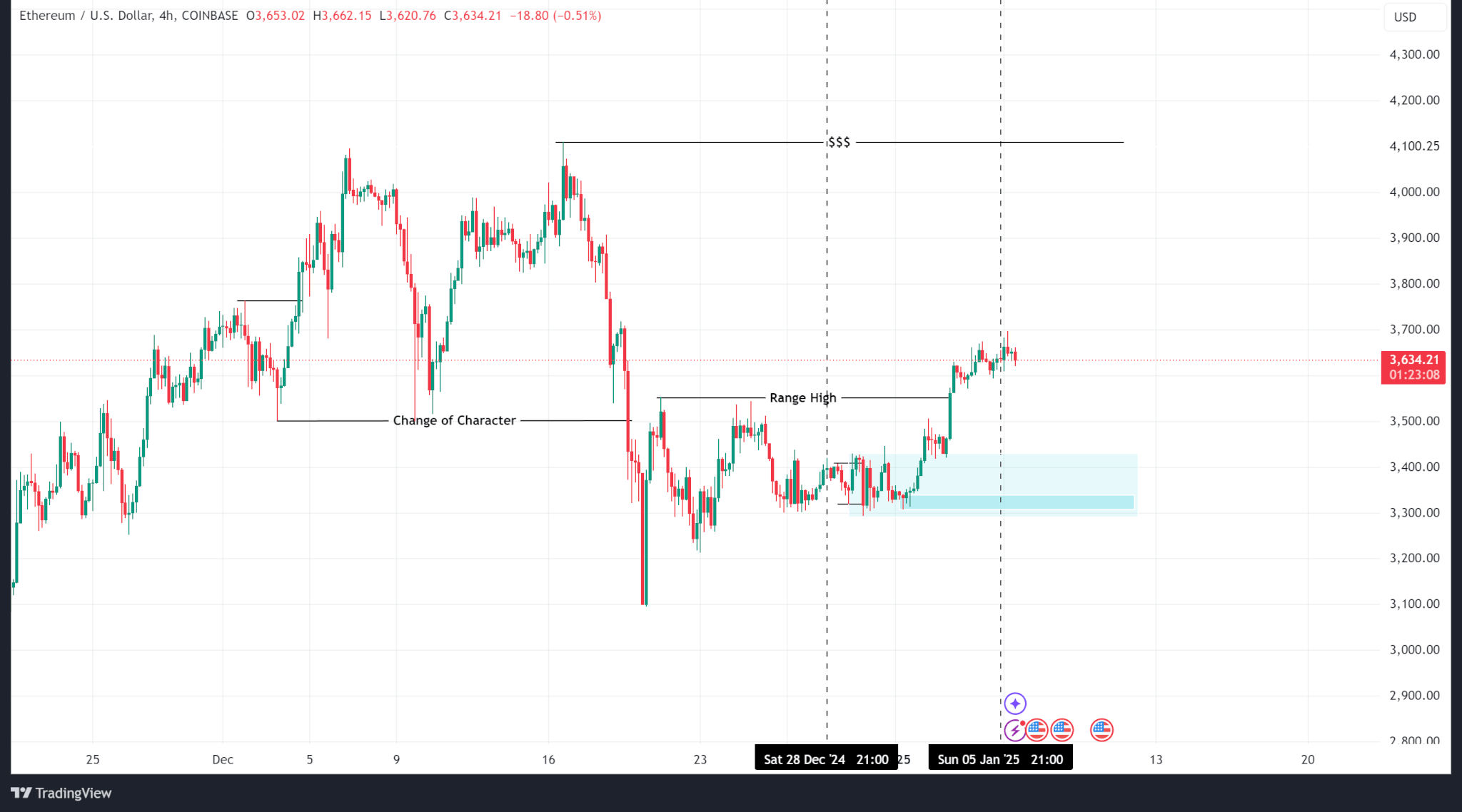 While the price has broken through the last range high, it must clear the recent high, which is at the $4,096.44 level, to resume a bullish trend. In the interim, a demand level at the $3,500.00 level could serve as liquidity for an upward.