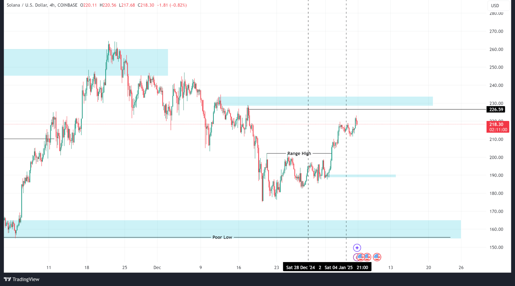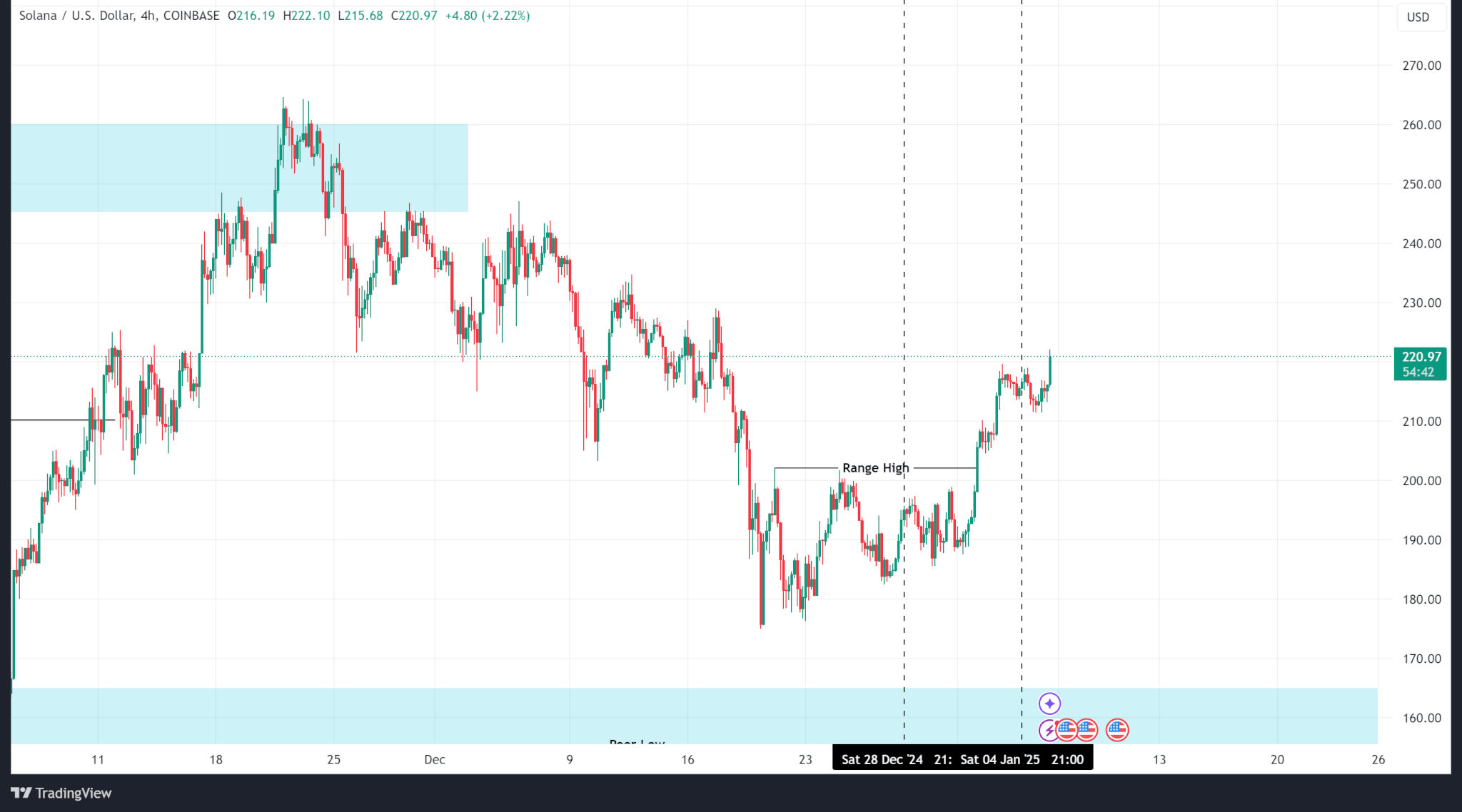Solana’s price action was bullish last week as it broke above the local range high from the previous week’s trading session. Weekly low and high formed were $185.55 and $219.67.