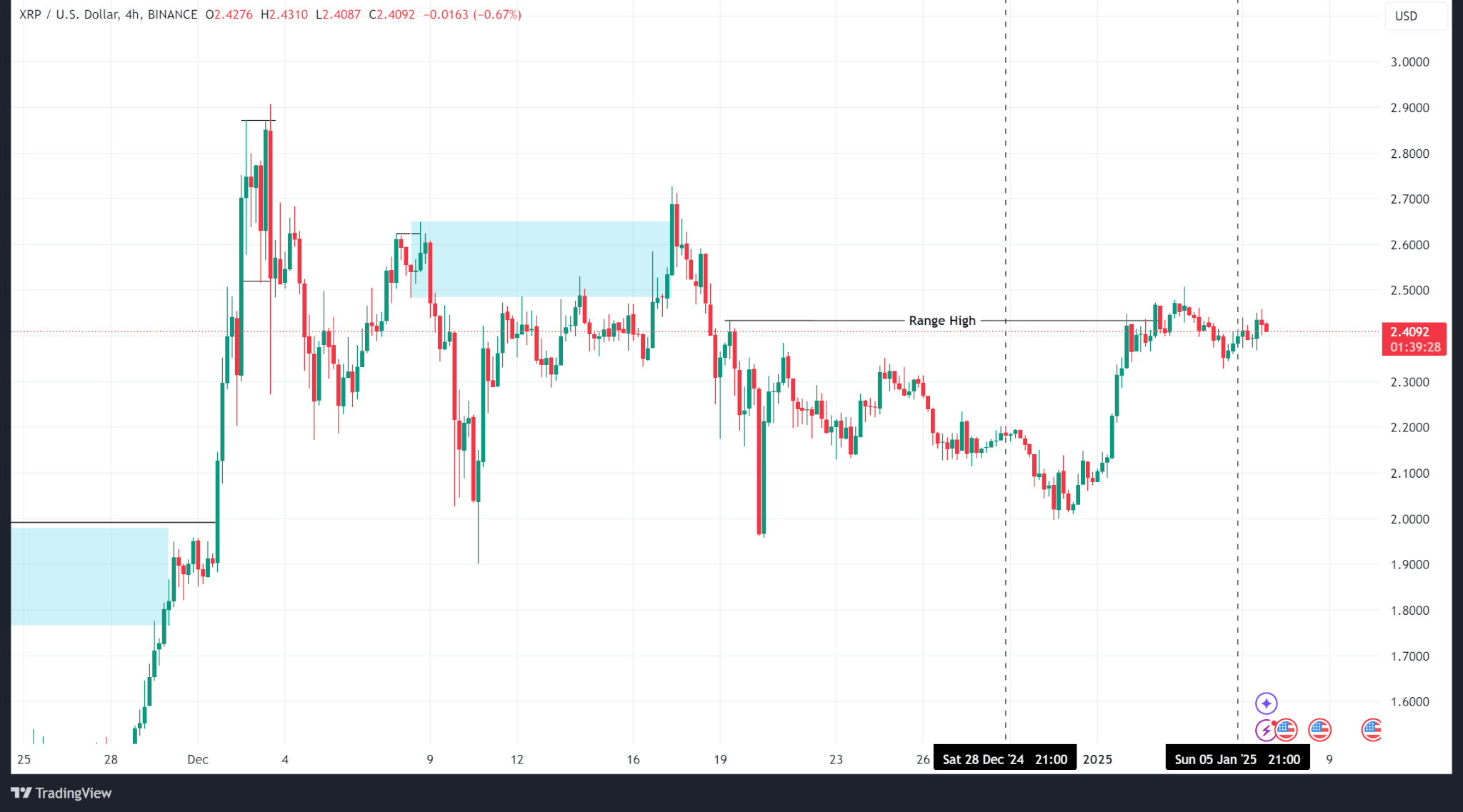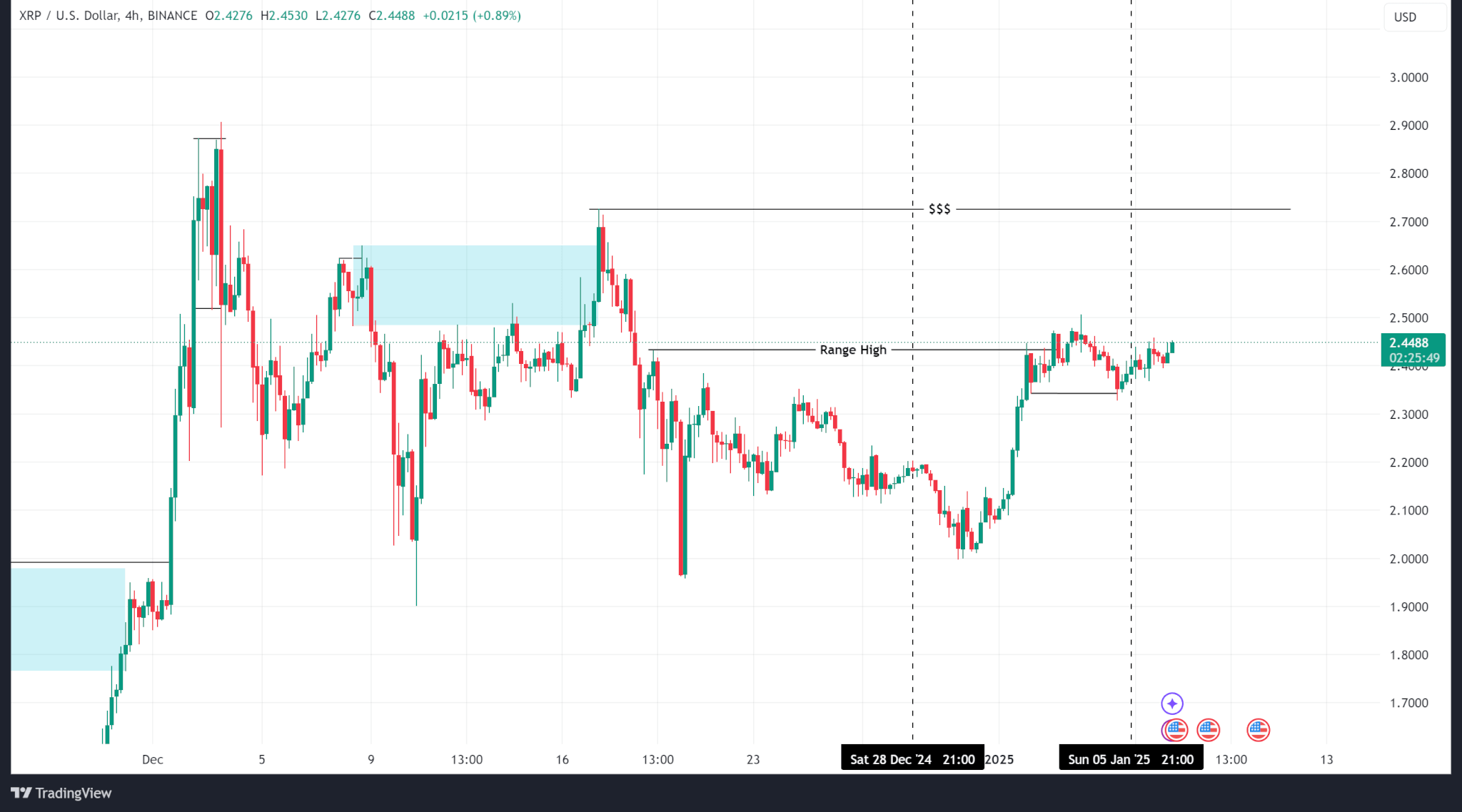 Since breaking above the range high and pulling back for liquidity at the last higher low at $2.34, XRP’s price has logged higher highs and lows, climbing towards the next supply zone around $2.72.