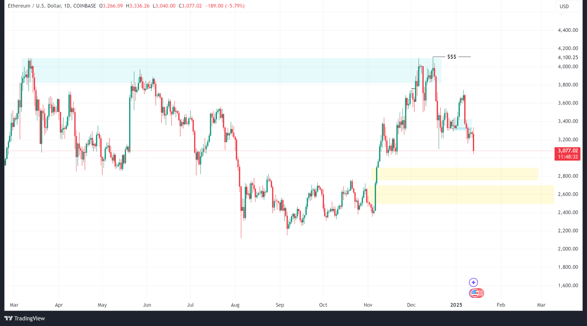 Ethereum’s price also logged a negative week, falling from a high of $3,744 to a low of $3,157 before closing at $3,236. ETH price action tested March 2024’s high of $4,089 in early Dec 2024 but failed to break above and has been logging lower lows since.