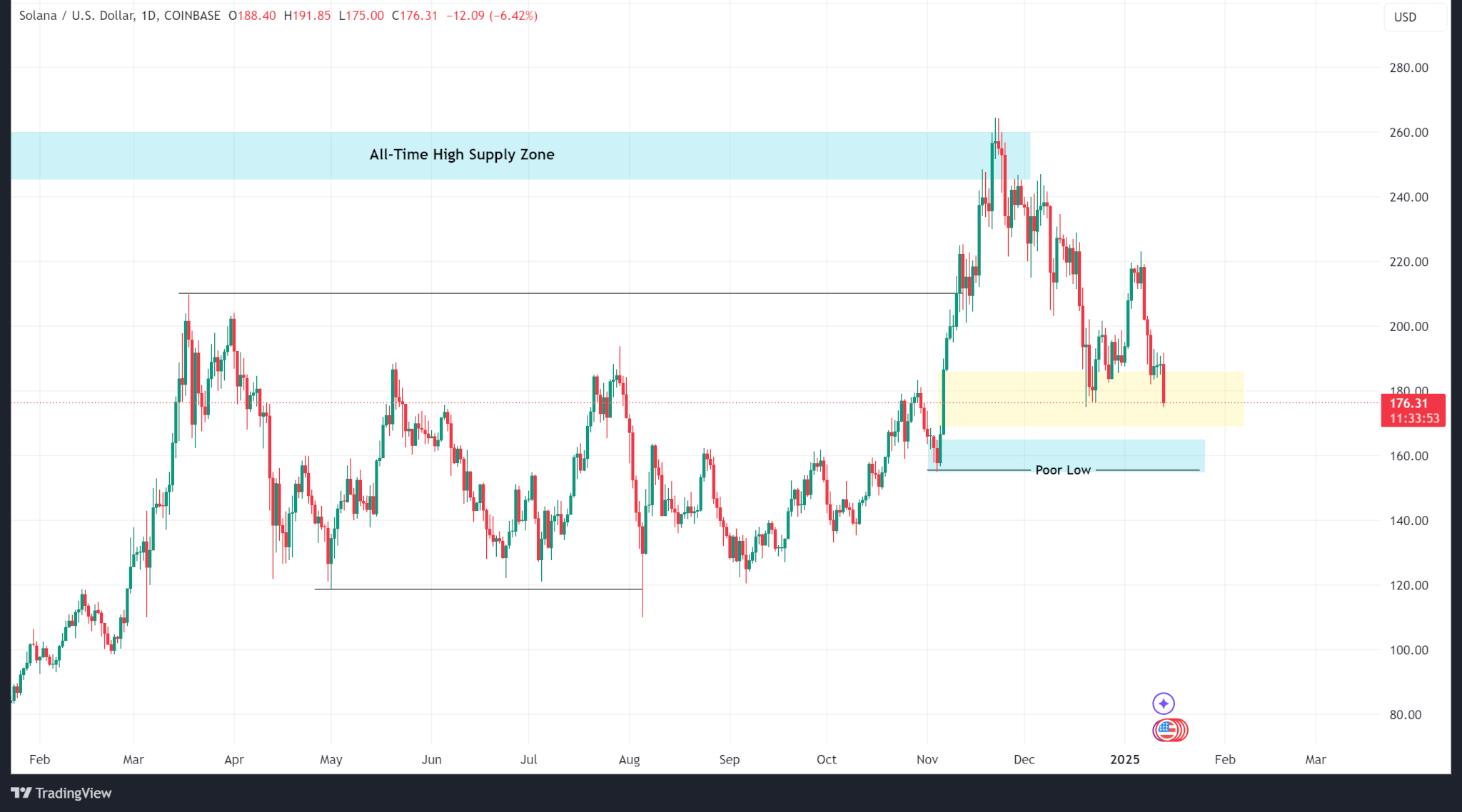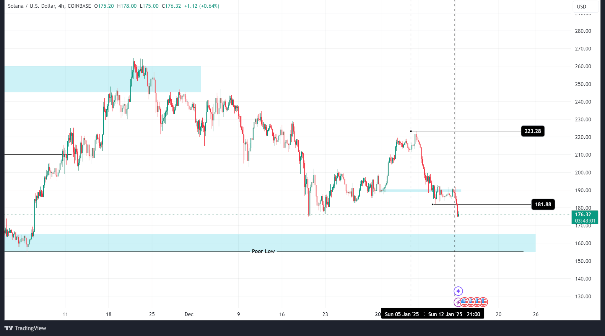 Solana’s price fell from a weekly high of $223 to a weekly low of $181 before eventually closing at $188, logging a total loss of 12.53%. SOL continues to trend lower after failing to close above its all-time high of $260.