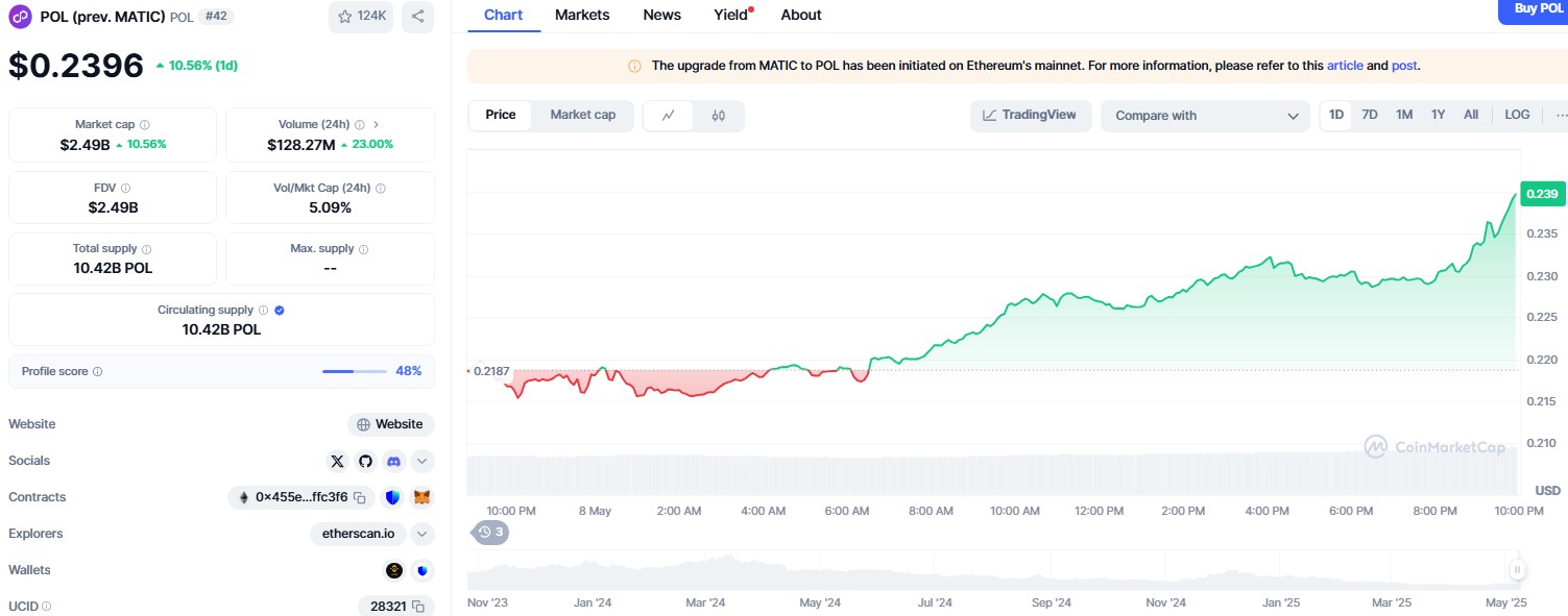 As of early May 2025, POL trades near $0.23, far from its March 2024 peak of $1.29.