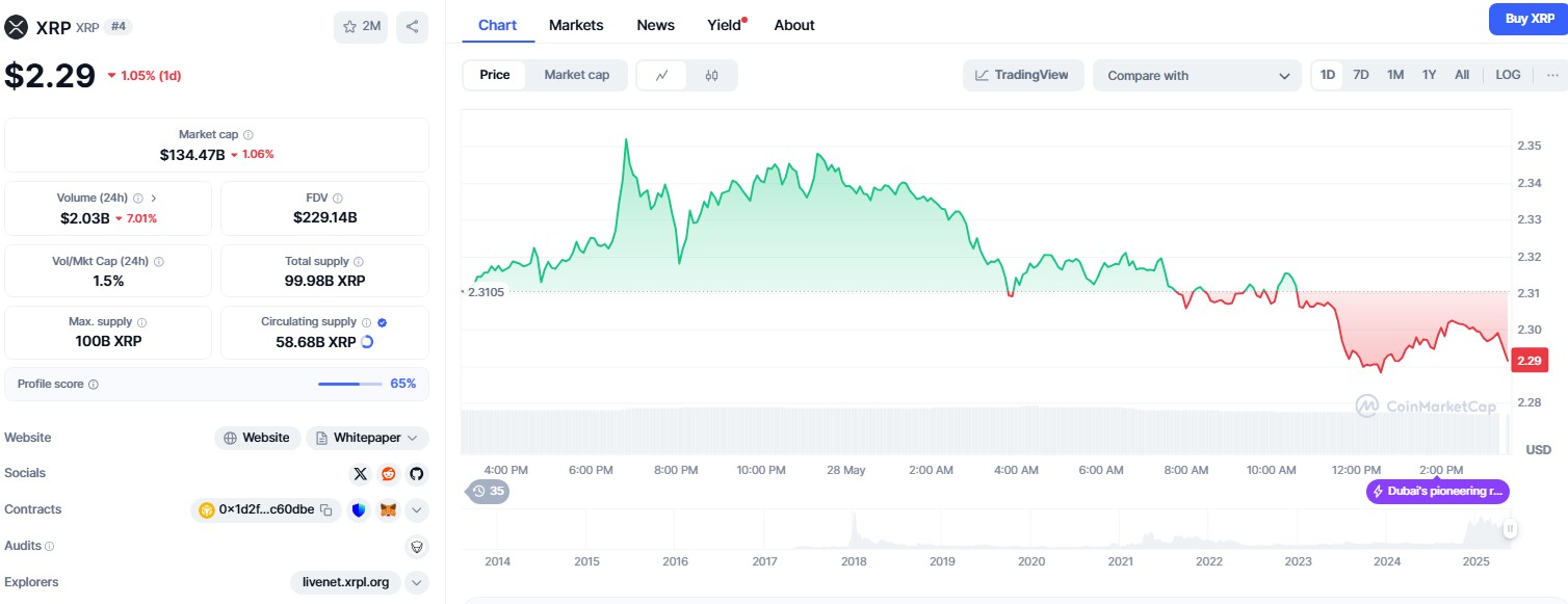XRP has lost momentum again, dropping by 1.05% over the last 24 hours to trade at $2.29.
